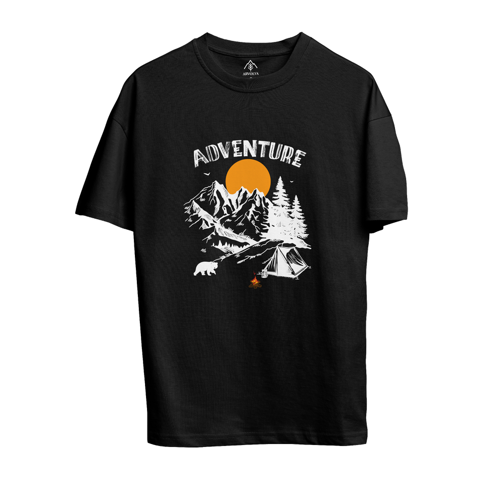 Macera dağlarda kampta temalı baskılı t-shirt.